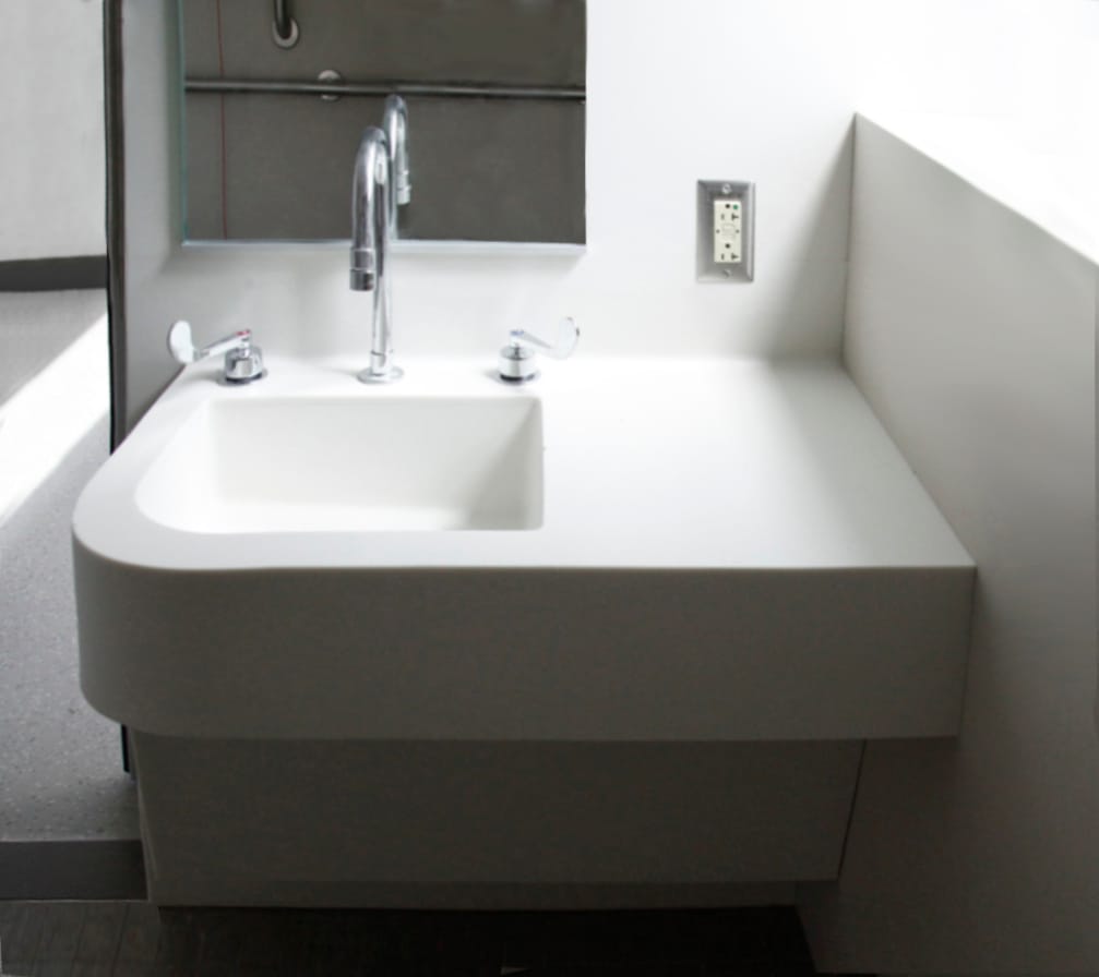 Custom sink modules were designed for each of the patient rooms (right handed, left handed and bariatric) which were integrated into the Corian® walls.