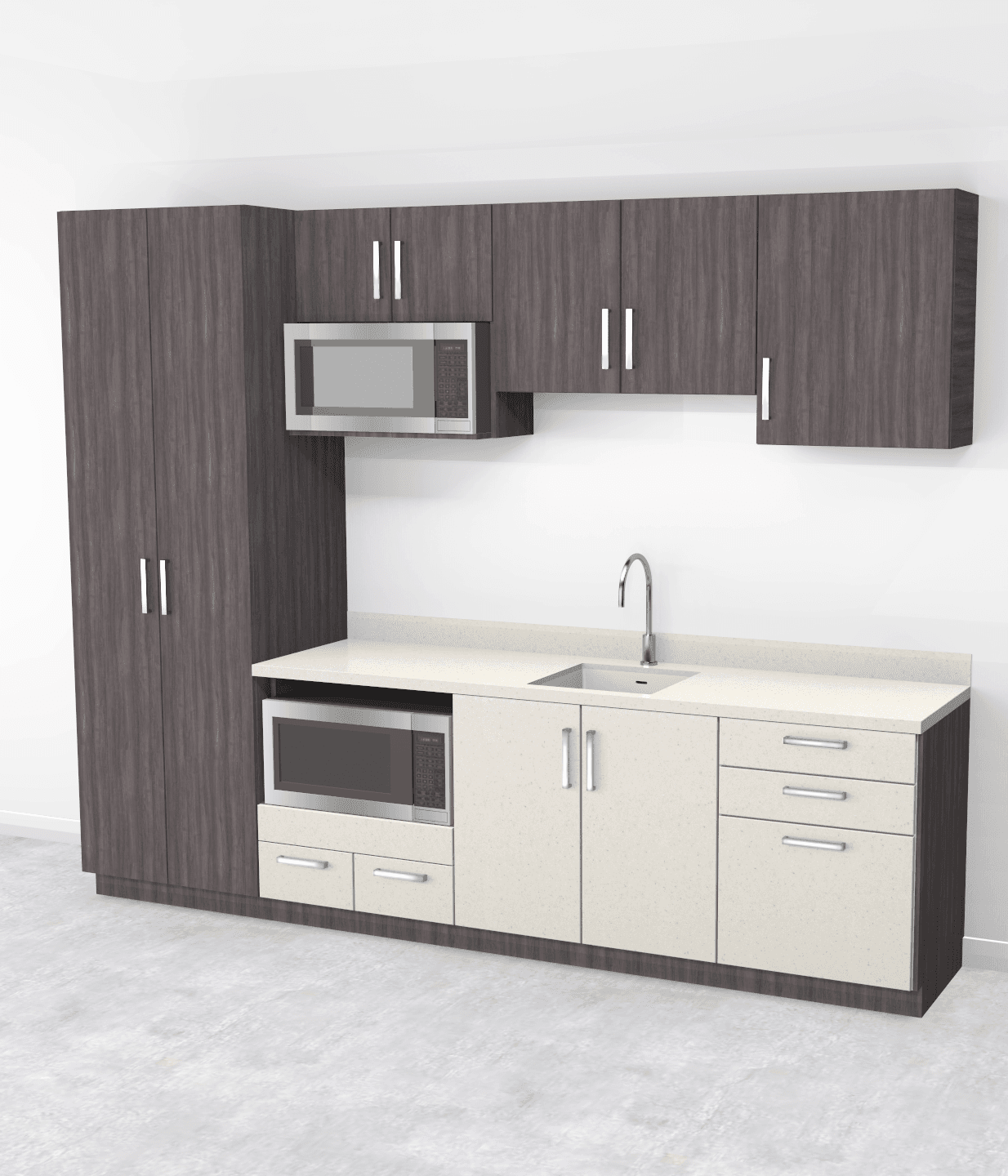 Corian® solid surface resists chipping, peeling, scratching, and staining for exceptional durability. Impact-resistant base cabinet doors further enhance life-cycle performance in high-use settings. Corian®, laminate, and thermofoil components can be specified across interior and exterior applications, offering a wide range of colors and woodgrain finishes for greater design flexibility and a more cost-effective alternative to the C-Series all-Corian® casework system.