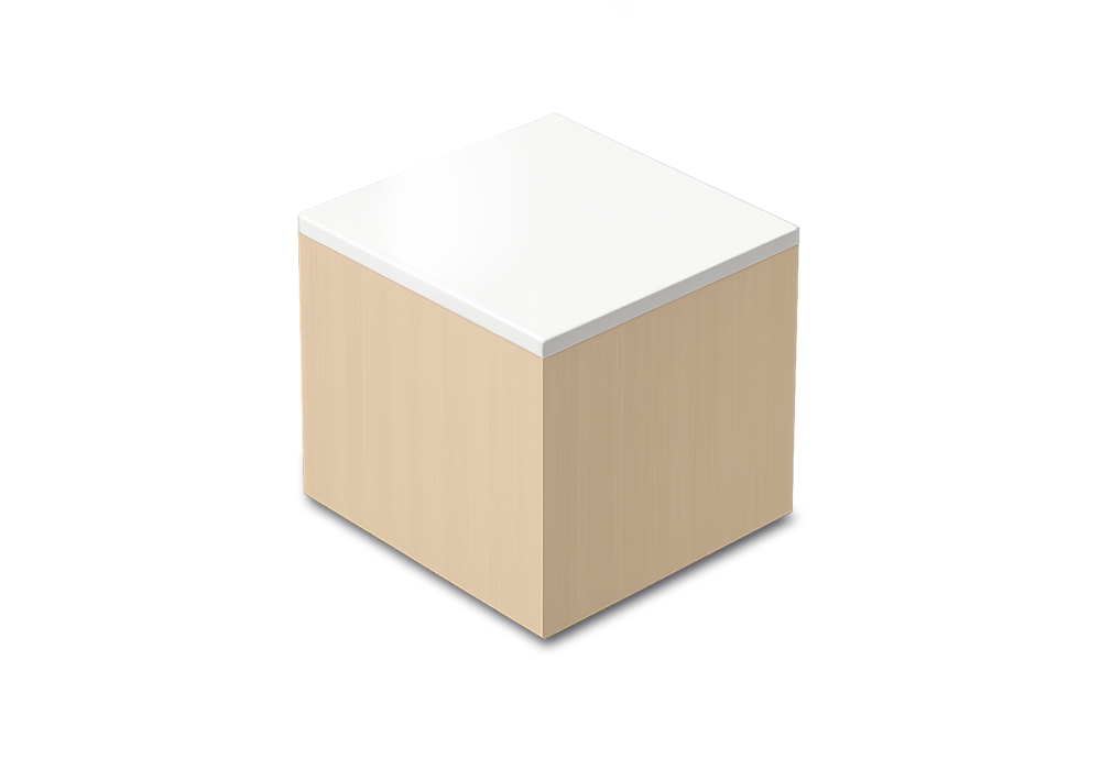 Cube shaped occasional table with solid surface top and laminate wood-look base