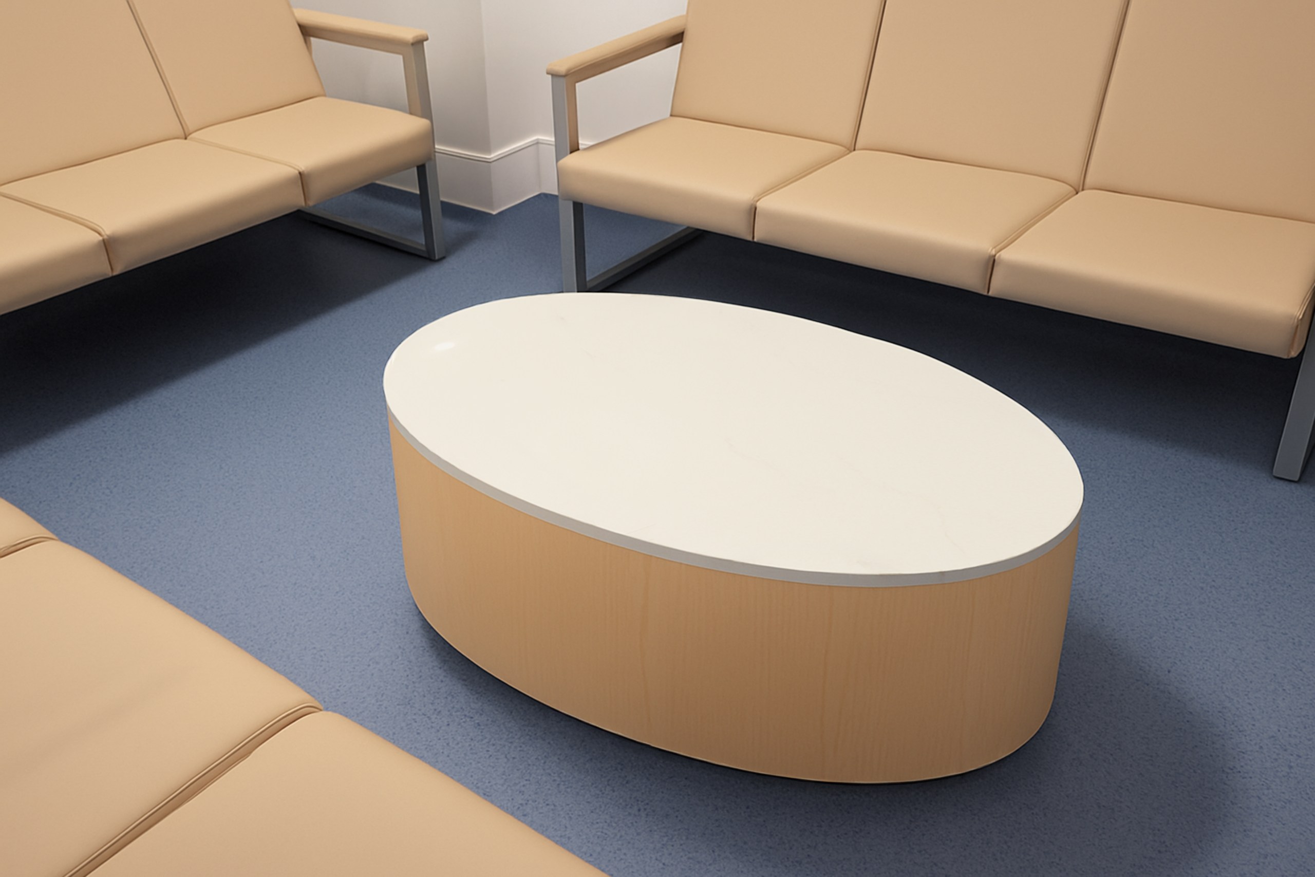 Designed for maximum durability, hygiene and long-term value. Featuring a bleach cleanable Corian® solid surface table top and a bleach cleanable thermofoil or laminate base. Our unique SpotGuard surface finish helps reduce unsightly finger prints and marks on solid surfaces for lower maintenance. Adaptable by size, color and technology integration, including seamless wireless charging and power outlets. Ideal for commercial and healthcare environments.