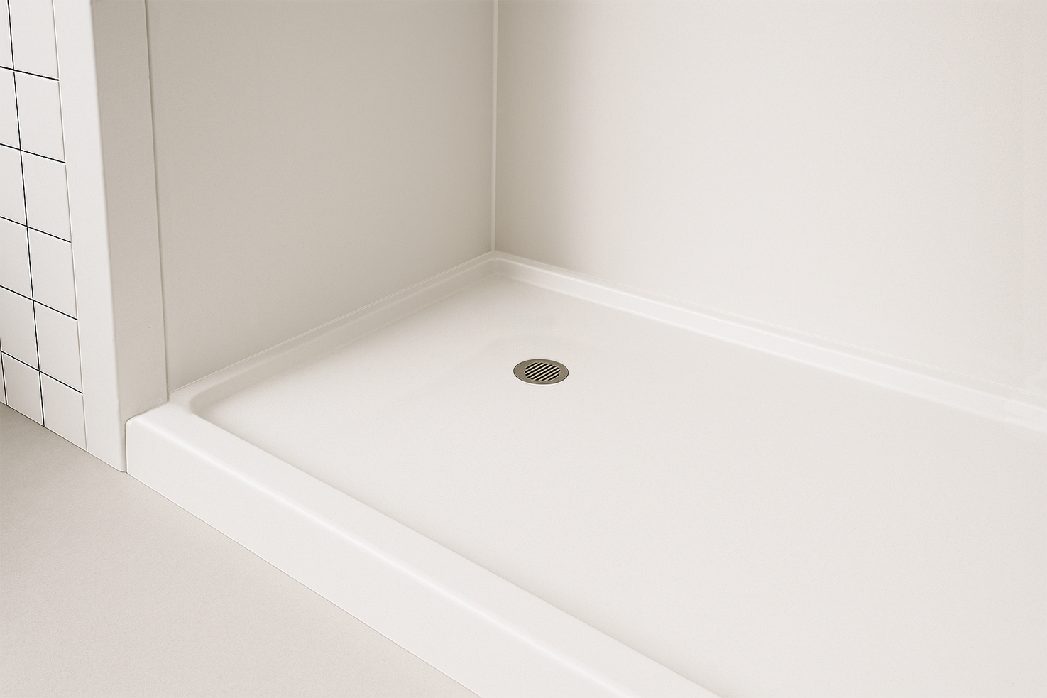 The versatile shape complements any space and creates a waterproof, low-maintenance environment that eliminates tile and grout. Options include coved or square corners and custom sizes, all featuring a raised threshold design that supports water containment, improved drainage, simplified installation and assisted access.