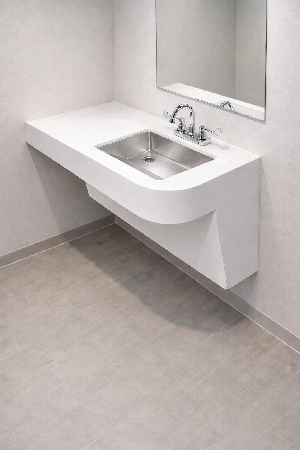 Bleach-cleanable, nonporous surfaces support the highest infection control standards and long-term durability. Includes a removable tamper resistant plumbing enclosure for security and service access. ADA compliant and fully adaptable by length, number of sinks and color. Ideal for high-traffic restroom applications including airports, healthcare and hospitality.