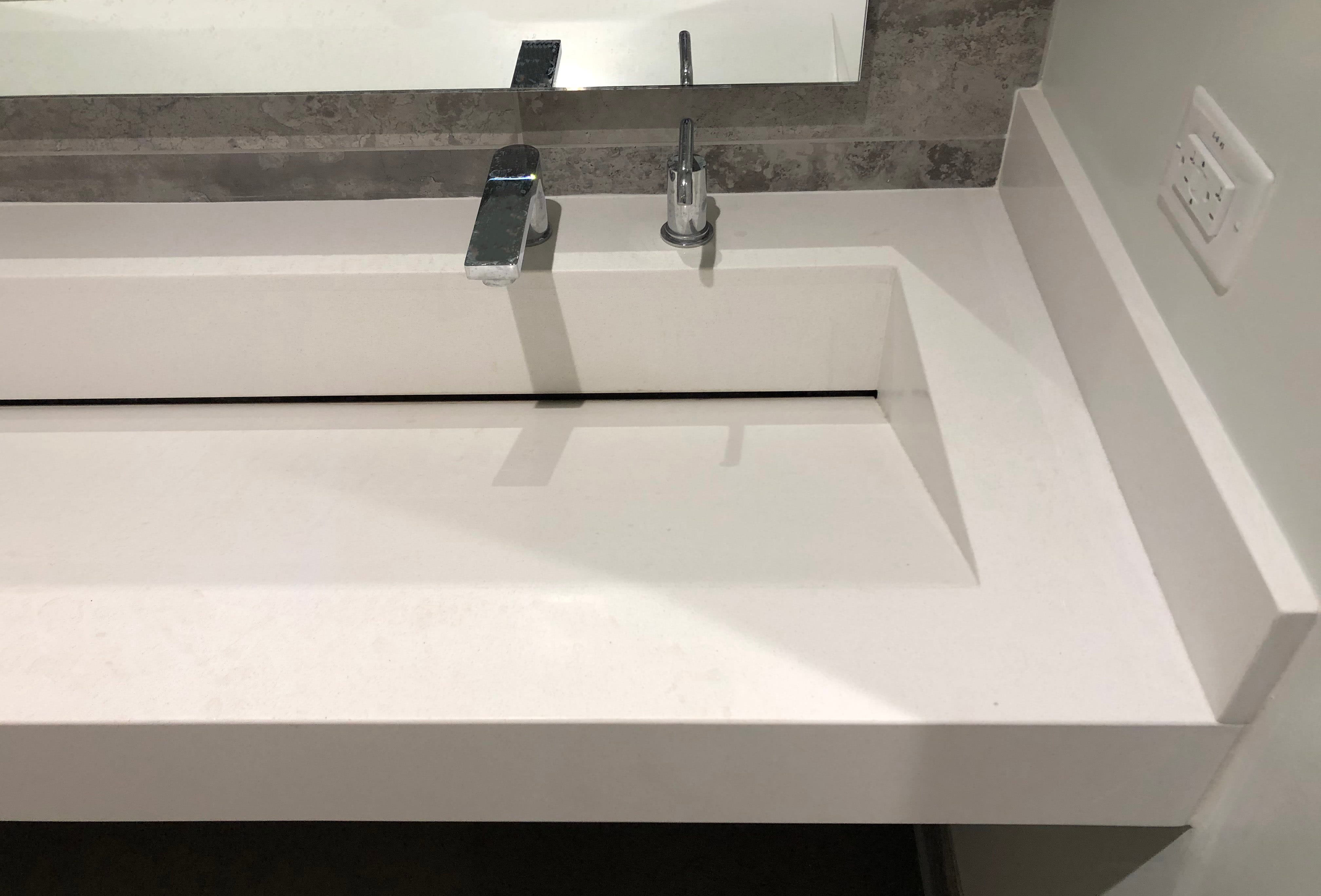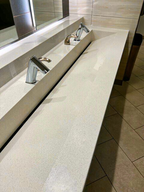 The NatroLINE trough sink features an integrated sink and countertop made with Quartz that combines the elegance of natural stone with lasting durability and easy cleanability. The graduated, anti-splashback basin slope directs water into a sleek linear slot channel, for a contemporary and minimalist look. Sink surfaces are non-porous, bleach and resist virus, bacteria and mold growth to support a hygienic restroom environment. Ideal for premium offices, airports, universities, healthcare and hospitality settings.