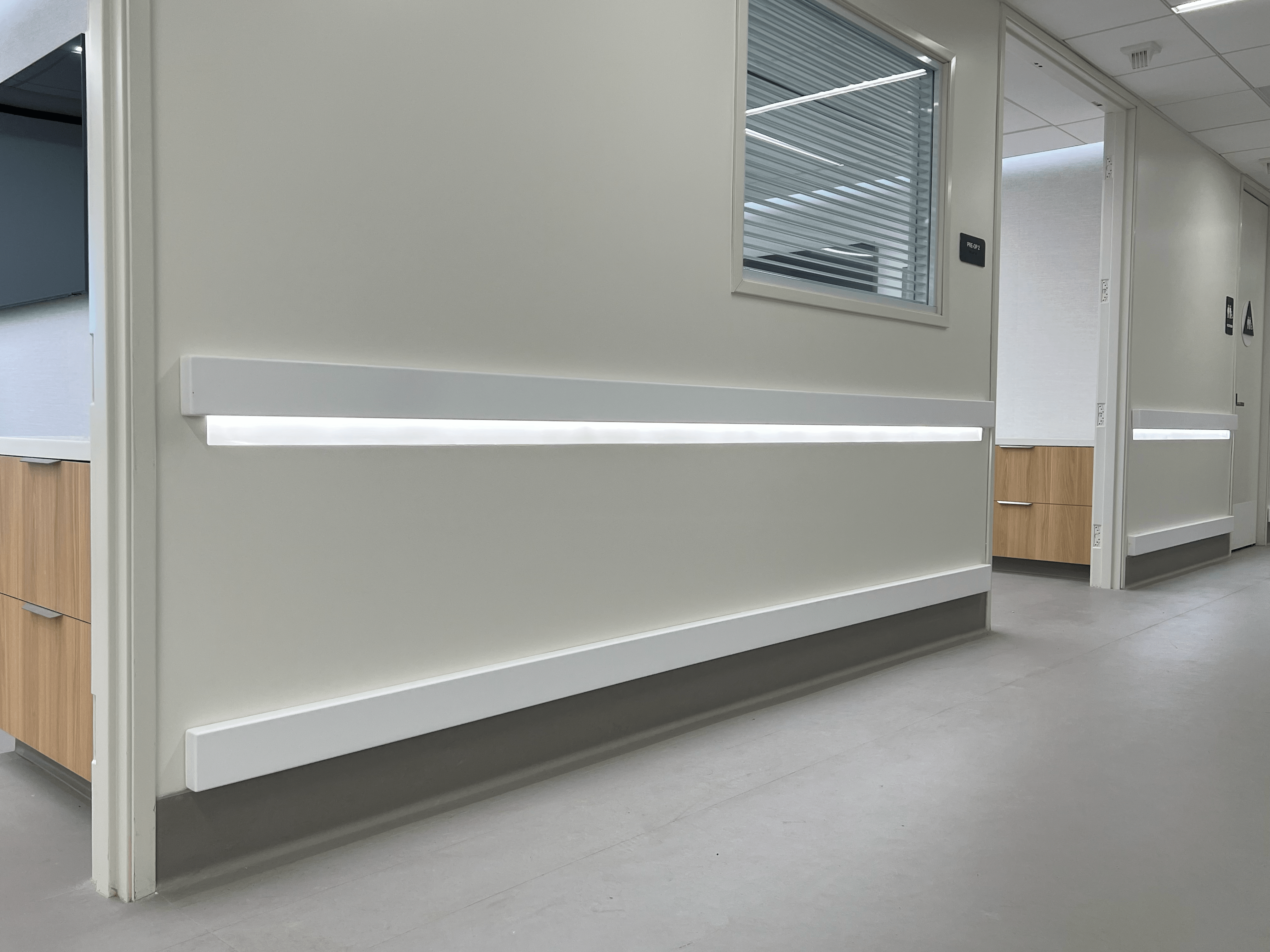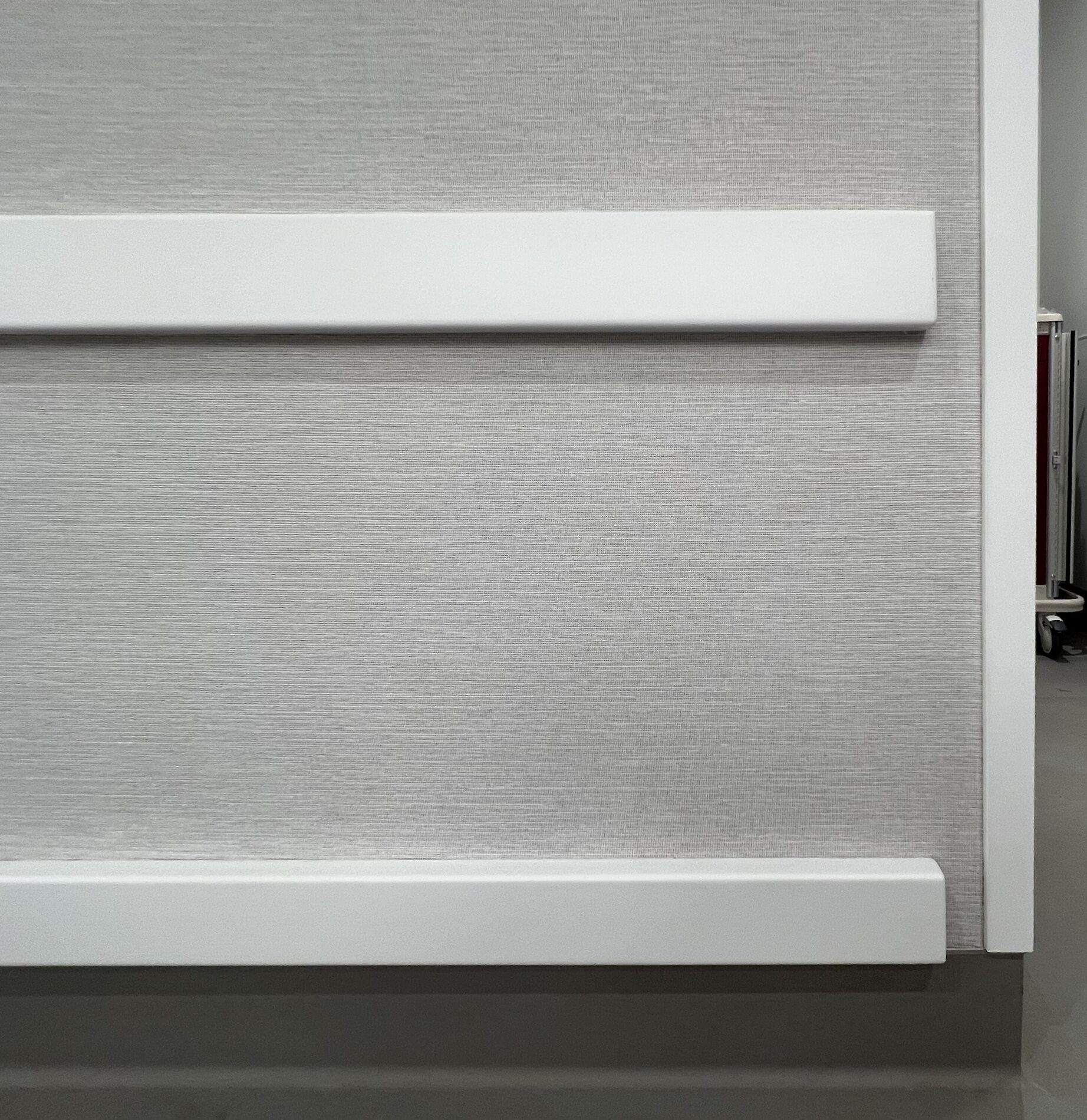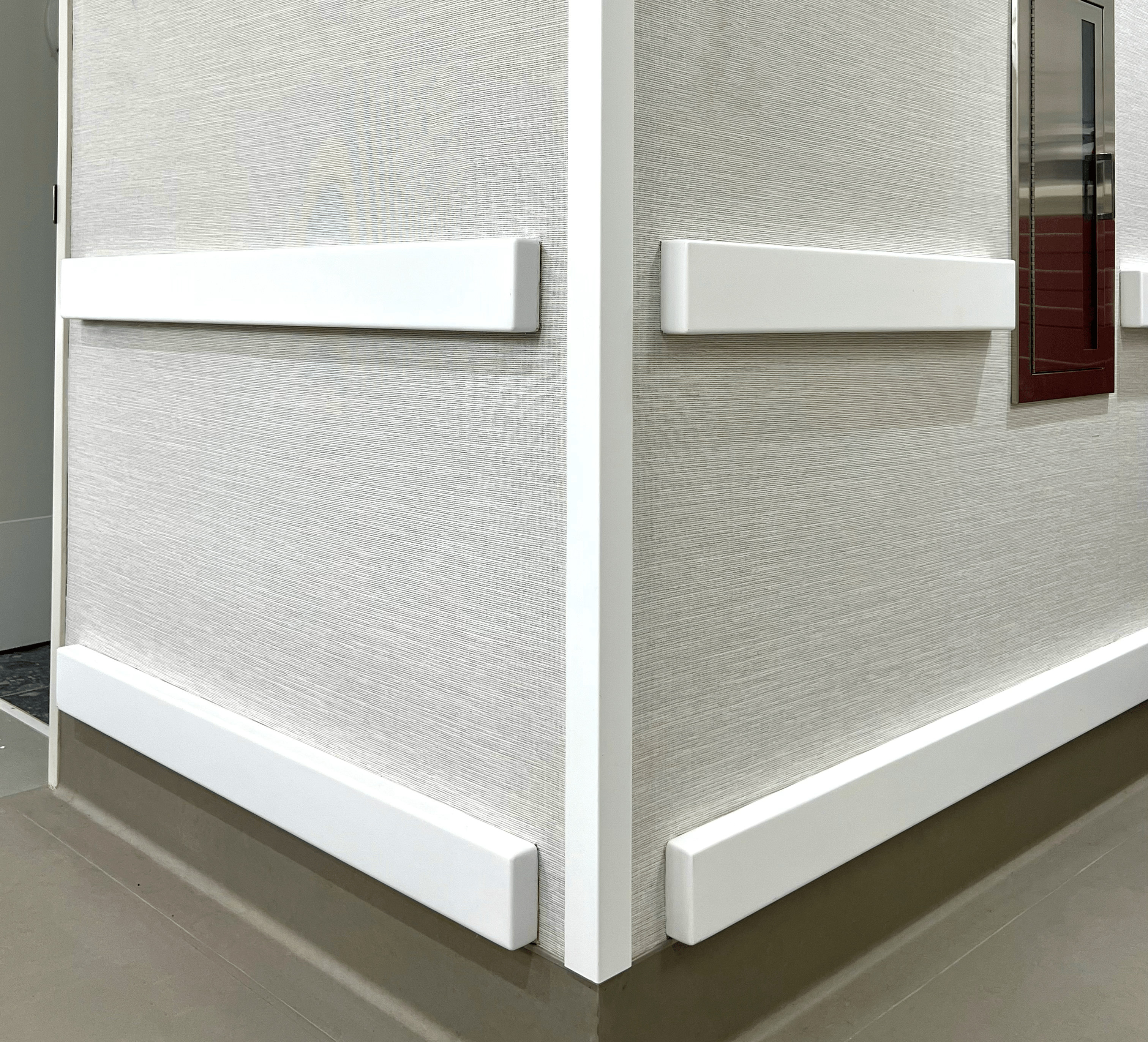 Halo Bumper Rails, made with Corian solid surface, provide vulnerable wall areas with a hygienic and impact resistant barrier of protection. Bumper Rail surfaces are non-porous, bleach cleanable and resist the growth of viruses, bacteria and mold to support the highest level of infection control. Ideal for healthcare, behavioural health and long-term care facilities, where everyday damage from pedestrians or wheeled traffic is likely to occur.